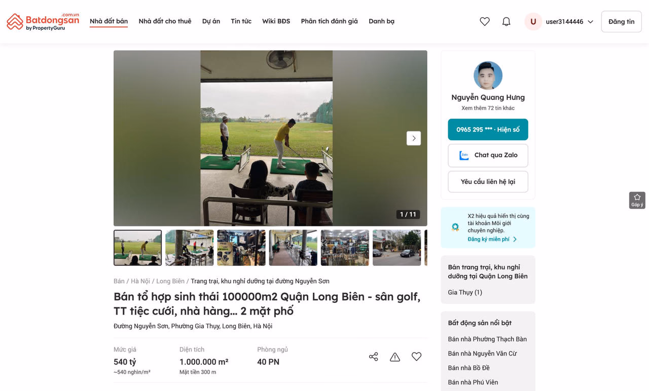 Theo thông tin đăng tải trên batdongsan.com.vn, ngày 12/6, một đơn vị đang rao bán một tổ hợp sinh thái 10ha tại quận Long Biên với mức giá 540 tỷ đồng.