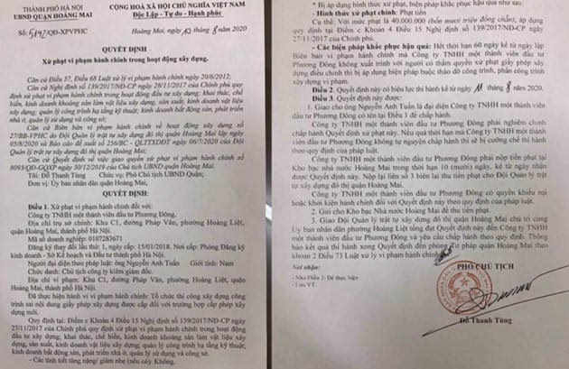 Cụ thể, trước đó ngày 10/8/2020, UBND quận Hoàng Mai đã có quyết định số 5142/QĐ XPVPHC do phó Chủ tịch Đỗ Thanh Tùng ký về việc xử phạt vi phạm hành chính số tiền 40 triệu đồng đối với công ty TNHH MTV đầu tư Phương Đông do đã tổ chức thi công công trình sai với giấy phép xây dựng được cấp tại dự án Phương Đông Green Park (số 1 Trần Thủ Độ, phường Hoàng Liệt, quận Hoàng Mai, Hà Nội).