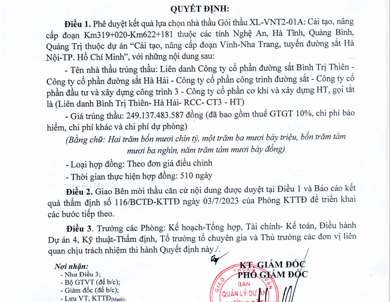 Trúng thầu là Liên danh Công ty CP Tổng công ty công trình đường sắt – Công ty CP Tổng công ty cơ khí xây dựng Thăng Long – Công ty CP Đường sắt Hà Hải – Công ty CP Đường sắt Nghệ Tĩnh. Giá dự toán gói thầu 193.509.456.000 đồng, giá trúng thầu 193.307.732.748 đồng.