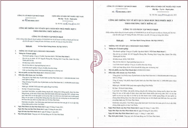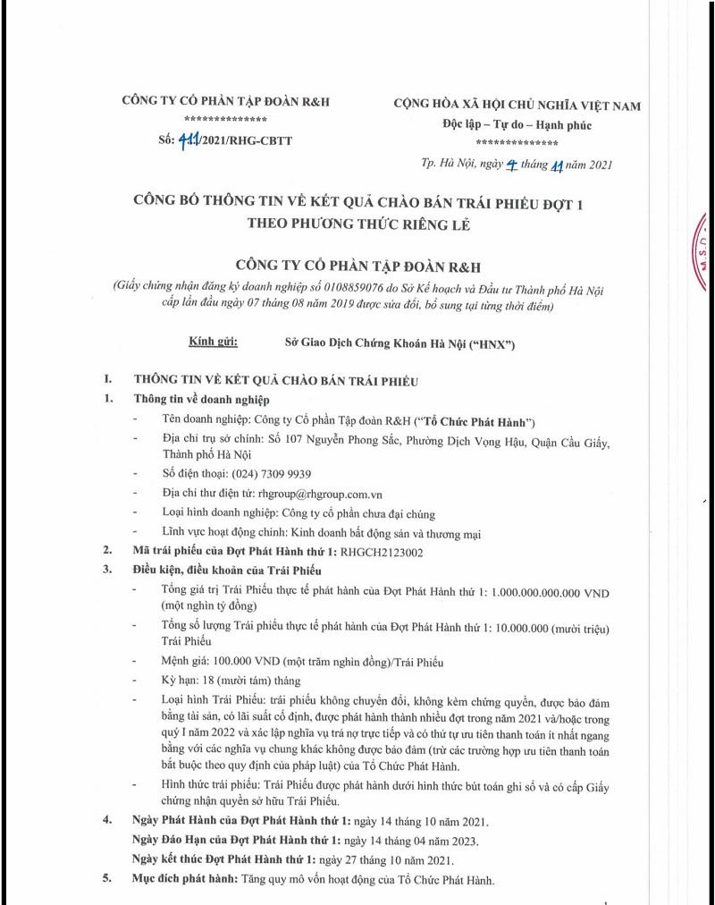 Ngoài hai đợt phát hành trên, vào ngày 4/11, R&H Group cũng đã thông báo hoàn thành đợt phát hành trái phiếu lần 1 với giá trị 1.000 tỷ đồng. Lô trái phiếu được phát hành vào ngày 14/10/2021, ngày đáo hạn vào 14/4/2023. Được hoàn thành vào ngày 23/10/2021. Đây là loại trái phiếu không chuyển đổi, không kèm chứng quyền, kỳ hạn 18 tháng, lãi suất cố định và có tài sản đảm bảo.