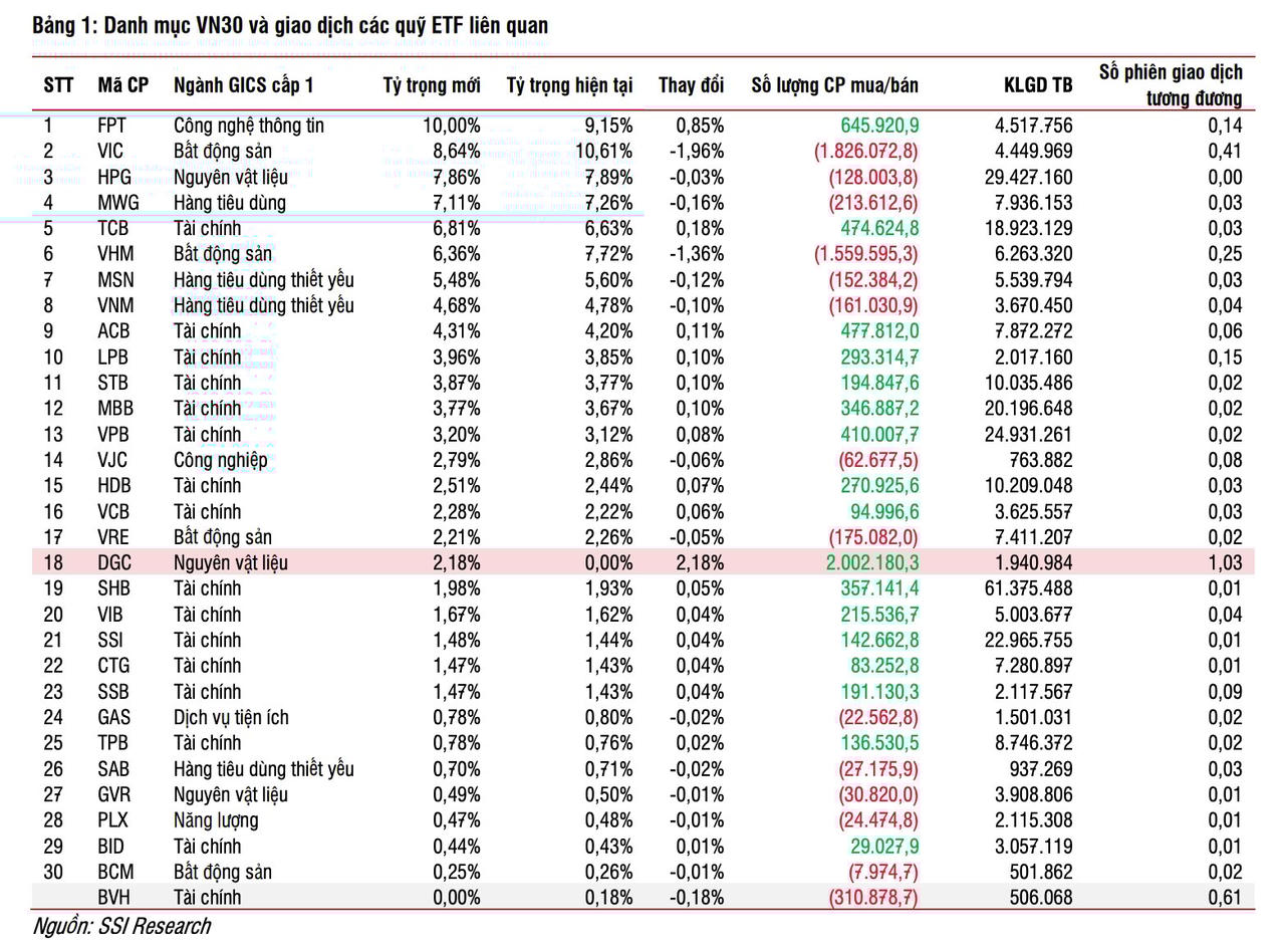 Với dự báo thay đổi thành phần chỉ số, các quỹ ETF mô phỏng VN30 có thể thực hiện giao dịch khối lượng lớn trong kỳ tái cơ cấu. Ước tính, sẽ có khoảng 2 triệu cổ phiếu DGC được mua vào, trong khi các cổ phiếu như VIC (1,8 triệu cổ phần), VHM (1,5 triệu cổ phần), và BVH (310.000 cổ phần) có thể bị bán ra. Ngoài ra, các cổ phiếu như FPT, ACB, TCB cũng có thể được tăng tỷ trọng đáng kể.