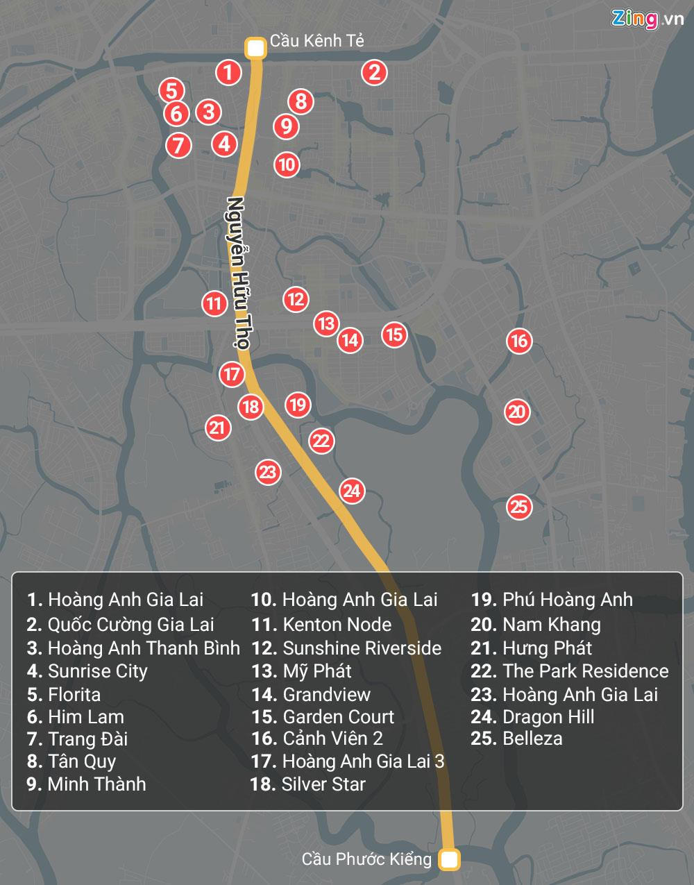 Hàng loạt các đại gia bất động sản trong và ngoài nước đều đang chen chân giành chỗ trên trục đường này, với các dự án hàng nghìn căn hộ. Đơn cử là Sunrise City và Sunrise Riverside của Novaland, Dragon City của Phú Long, Hưng Phát Silver Star của Hưng Lộc Phát...