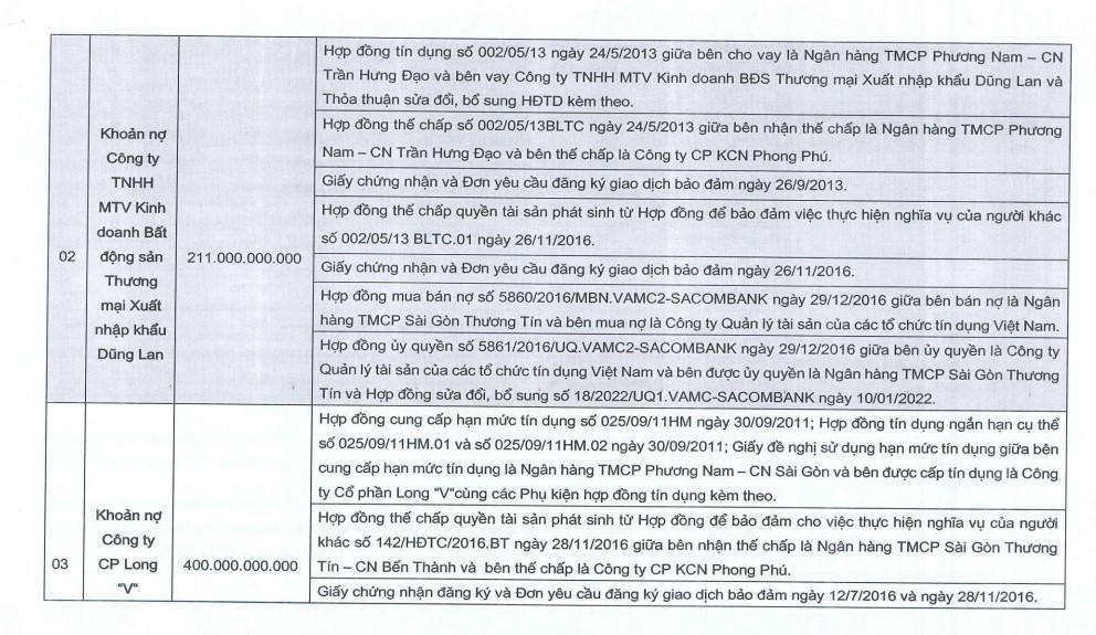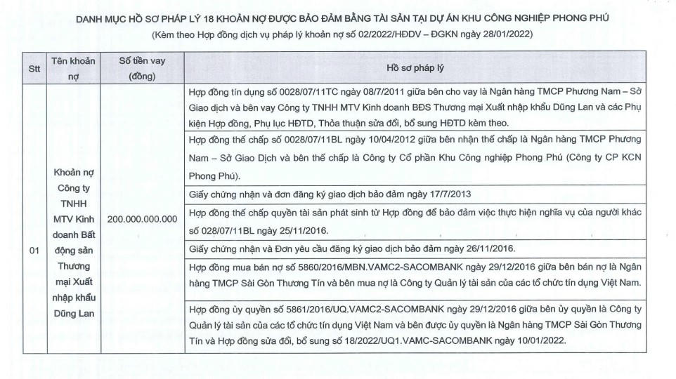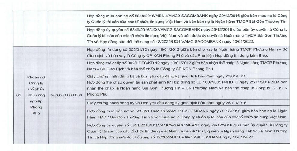 Theo thông báo được đưa ra, tài sản bán đấu giá là toàn bộ 18 khoản nợ được bán không tách rời được đảm bảo bằng quyền tài sản tại dự án KCN Phong Phú, huyện Bình Chánh, TP HCM theo nguyên trạng khoản nợ, bao gồm chuyển giao toàn bộ quyền, nghĩa vụ của chủ nợ liên quan đến các khoản nợ và toàn bộ quyền, nghĩa vụ của bên nhận đảm bảo đối với các tài sản đảm bảo khoản nợ này.