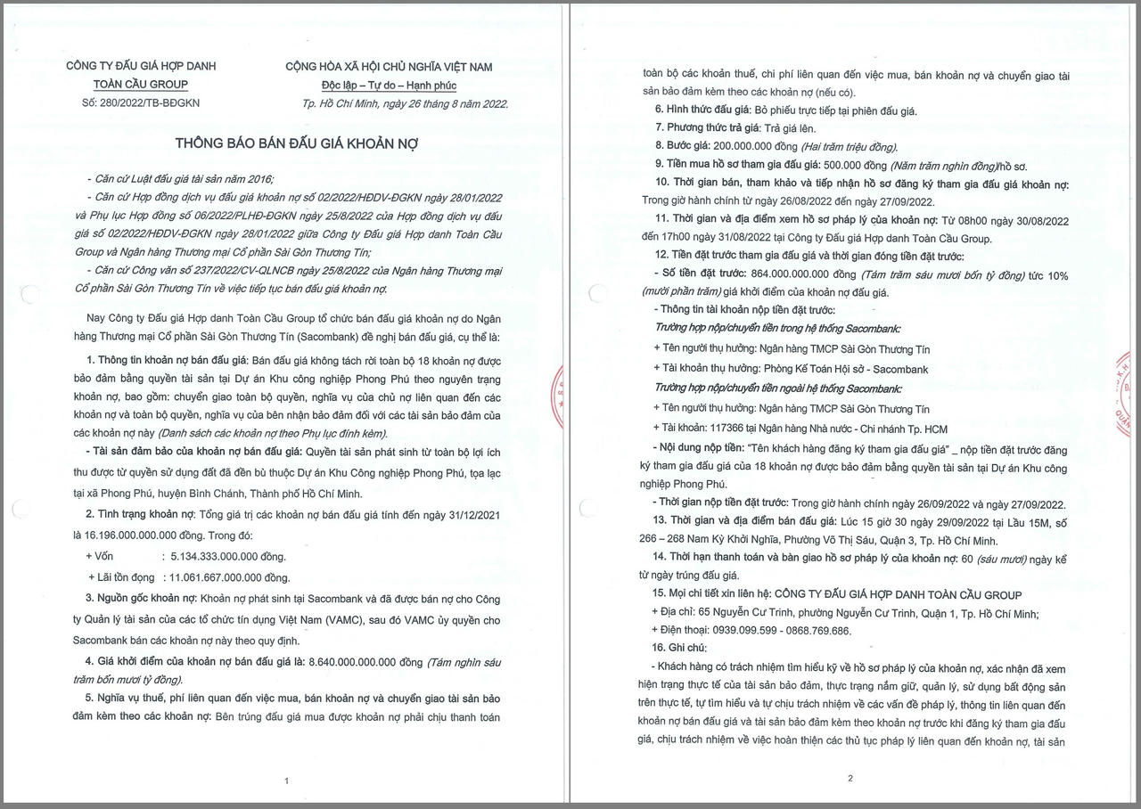 Công ty Đấu giá hợp danh Toàn Cầu Group vừa có thông báo sẽ tổ chức bán đấu giá 18 khoản nợ được bảo đảm bằng tài sản tại Dự án Khu công nghiệp (KCN) Phong Phú do Ngân hàng TMCP Sài Gòn Thương Tín (Sacombank) đề nghị.