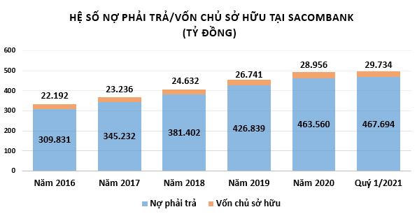 Hơn nữa, tính đến 31/3/2021, nợ phải trả tại Sacombank ghi nhận gần 467.694 tỷ đồng trong khi vốn chủ sở hữu chỉ có gần 29.734 tỷ đồng. Như vậy, nợ phải trả tại Sacombank gấp gần 16 lần vốn chủ sở hữu.
