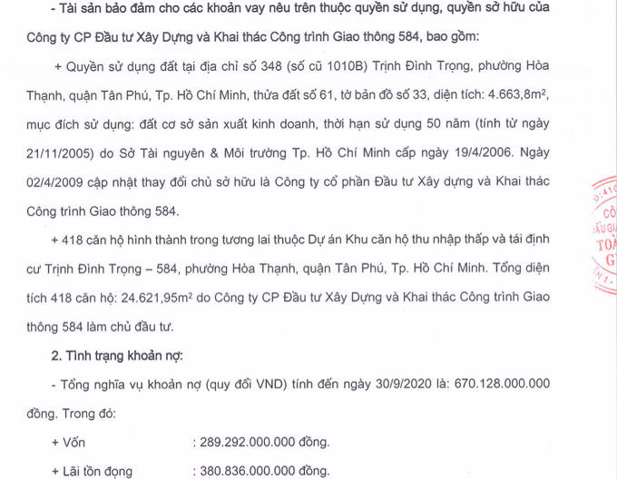 -Trong đó có khoản nợ của CTCP Đầu tư Xây dựng và khai thác công trình giao thông 584 tại Sacombank. Khoản nợ này có hợp đồng cấp hạn mức tín dụng ngày 8/9/2011 và ngày 19/6/2015 cùng các hợp đồng tín dụng ngắn hạn cụ thể, và các phụ lục, thoả thuận, sửa đổi bổ sung hợp đồng (nếu có) giữa Sacombank và CTCP Đầu tư xây dựng và khai thác công trình giao thông 584.