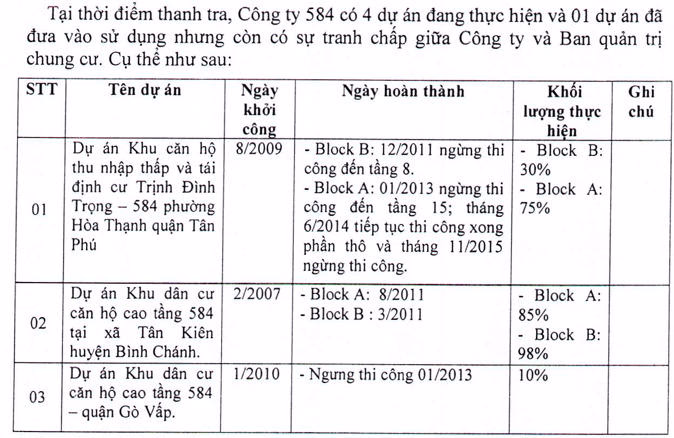 Thanh tra cũng nhận xét tại thời điểm đó Công ty 584 chỉ tự thực hiện thi công 3/5 dự án, còn 2 dự án chỉ thực hiện thủ tục pháp lý ban đầu, còn việc đầu tư kinh doanh chuyển giao lại cho Công ty Lilama SHB thực hiện bằng hình thức hợp tác đầu tư, trong đó có dự án tại Trịnh Đình Trọng nói trên. Kết luận thanh tra cũng ghi nhận các dự án trên của Công ty 584 thực hiện thi công không đúng cơ sở được phê duyệt, cơi nới làm tăng diện tích sử dụng…