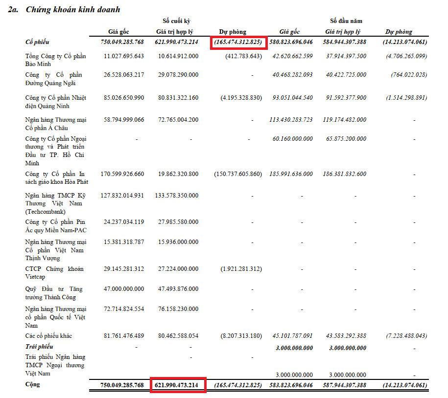 Đáng chú ý, công ty có khoản trích lập dự phòng cho chứng khoán kinh doanh đến hàng trăm tỷ đồng. Cụ thể, Công ty ghi nhận giá trị chứng khoán kinh doanh cuối năm có giá gốc 750 tỷ đồng, giá trị hợp lý cuối kỳ đạt 622 tỷ đồng.
