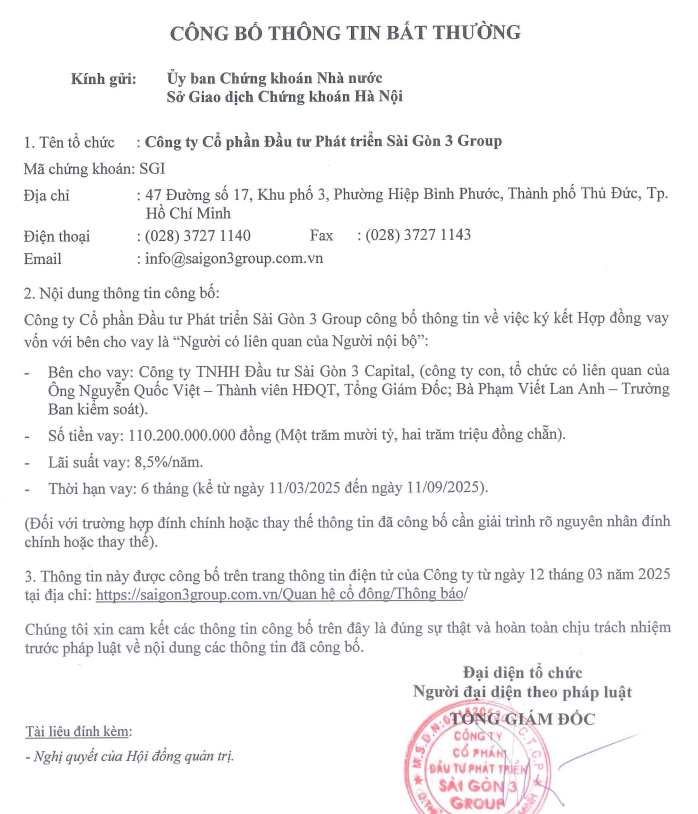 Cụ thể, CTCP Đầu tư Phát triển Sài Gòn 3 Group vay 110,2 tỷ đồng từ Công ty TNHH Đầu tư Sài Gòn 3 Capital, với lãi suất 8,5%/năm, thời hạn cho vay trong 6 tháng từ 11/03/2025 đến ngày 11/09/2025.