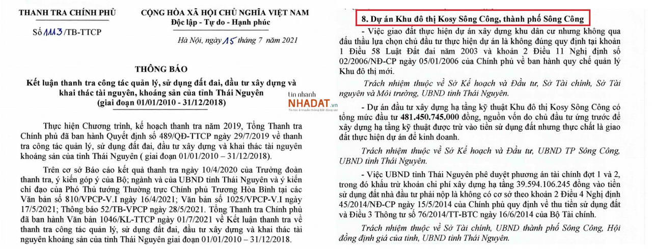 Cụ thể, Thanh tra Chính phủ đã nêu rõ tại dự án Khu đô thị Kosy Sông Công việc giao đất thực hiện dự án xây dựng khu dân cư nhưng không qua đấu thầu lựa chọn chủ đầu tư thực hiện dự án là không đúng theo quy định tại khoản 1 Điều 58 Luật đất đai năm 2003 và khoản 2 Điều 11 Nghị định số 02/2006/NĐ-CP ngày 05/01/2006 của chính phủ về ban hành quy chế quản lý Khu đô thị mới.