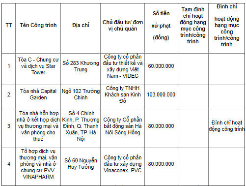 Trong số 58 công trình trên, có 26 công trình vừa bị phạt tiền từ 17,5 triệu đến 80 triệu đồng và vừa bị đình chỉ hạng mục. Các dự án này gồm: Tổ hợp nhà ở xã hội ở 30 Phạm Văn Đồng do Công ty CP đầu tư xây dựng và thương mại dịch vụ Bắc Hà làm chủ đầu tư; Chung cư Cảnh sát 113 ở Trung Kính (Yên Hòa) do Công ty TNHH Thăng Long làm chủ đầu tư; Dự án chung cư CT1, CT2 và CT3 khu đô thị Dream Town do Công ty cổ phần cơ khí xây dựng Đại Mỗ làm chủ đầu tư; tòa nhà Golden West do Công ty Cổ phần phát triển thương mại Việt Nam làm chủ đầu tư; Nhà ở kết hợp văn phòng Sakura Tower do Công ty cổ phần Hùng Tiến Kim Sơn làm chủ đầu tư; Toà nhà CT8, CT10 ở Tả Thanh Oai do Doanh nghiệp tư nhân số 1 tỉnh Điện Biên thuộc Tập đoàn Mường Thanh làm chủ đầu tư….