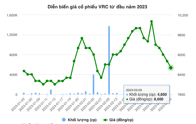 Thời điểm hiện tại, cổ phiếu VRC đang rơi vào đà lao dốc. Thị giá kết phiên 3/3 là 8.600 đồng/cp, giảm 34% trong 5 phiên gần nhất.