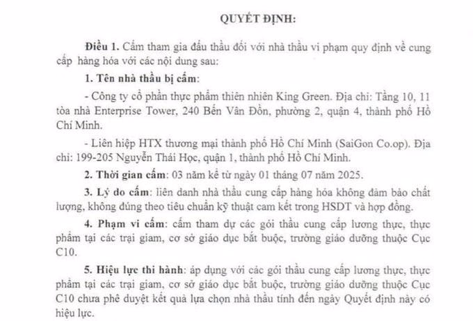 Với hành vi trên, 2 đơn vị sẽ bị cấm tham dự các gói thầu cung cấp lương thực, thực phẩm tại các trại giam, cơ sở giáo dục bắt buộc, trường giáo dưỡng thuộc Cục C10.