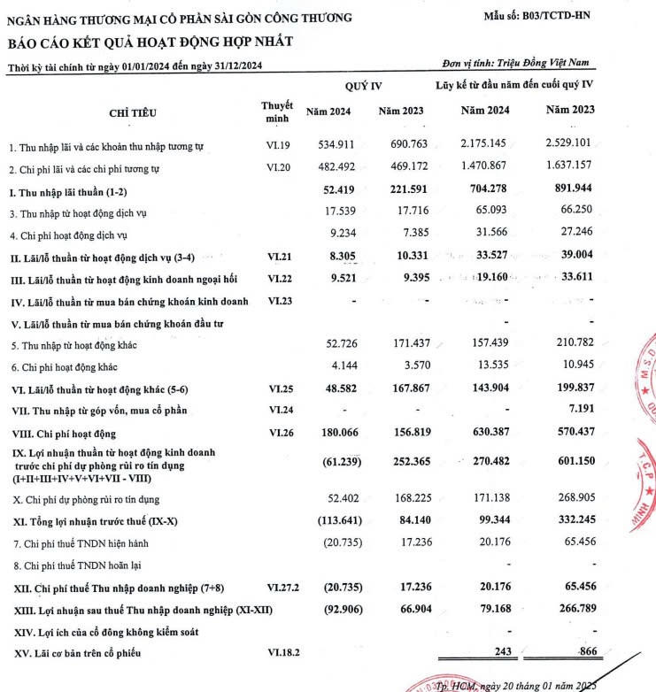 Trong quý 4/2024, thu nhập lãi thuần của Saigonbank đạt 52,4 tỷ đồng giảm 76% so với cùng kỳ năm 2023. Nguyên nhân do thu nhập lãi giảm 23%, trong khi chi phí trả lãi lại tăng 3%.