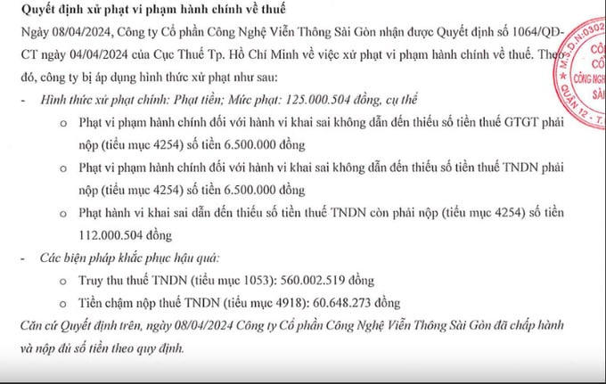 Cục Thuế Tp.HCM đã ra quyết định xử phạt Saigontel số tiền 125 triệu đồng, đồng thời truy thu thuế thu nhập doanh nghiệp 560 triệu đồng và tiền chậm nộp thuế thu nhập doanh nghiệp 60,6 triệu đồng.