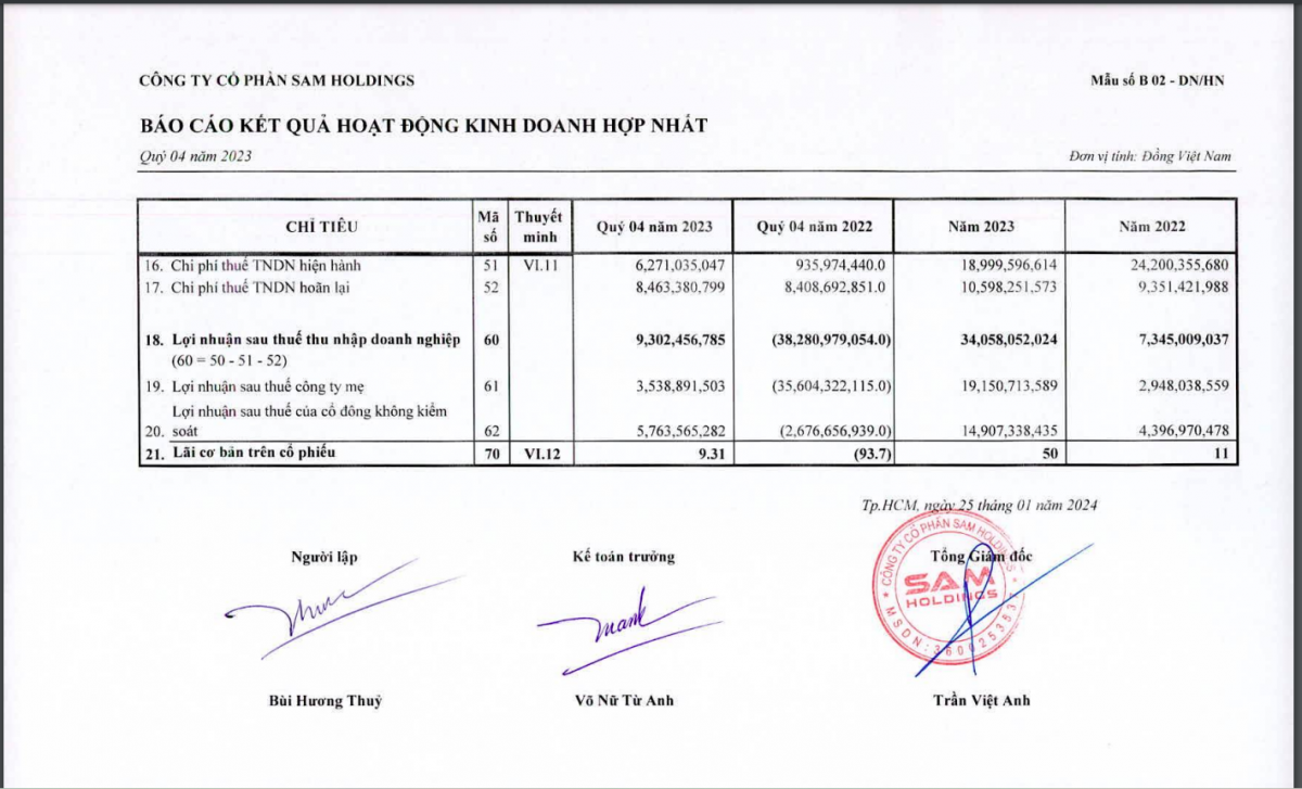 Hoàn cảnh tương tự cũng diễn ra vào năm 2023 khi lũy kế cả năm, SAM Holdings ghi nhận doanh thu đạt 2.200,12 tỷ đồng, tăng 4,3% so với cùng kỳ, lợi nhuận sau thuế đạt 34,06 tỷ đồng, tăng 363,4% so với cùng kỳ năm trước.