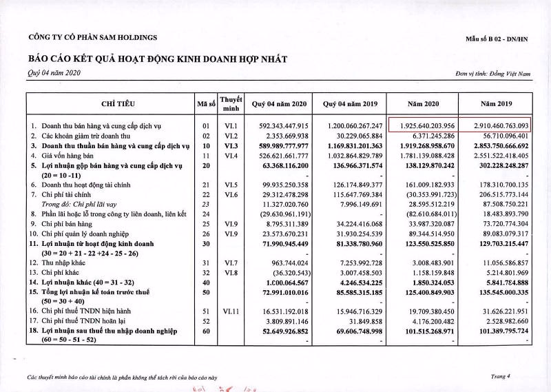 Về phía SAM Holdings, Theo báo cáo tài chính hợp nhất mới công bố, năm 2020, SAM Holdings ghi nhận doanh thu gần 1.926 tỷ đồng, giảm 33,81% so với năm 2019 và hoàn thành 61,98% mục tiêu cả năm (3.107,7 tỷ đồng). Lợi nhuận trước thuế năm 2020 đạt 125,4 tỷ đồng, giảm 7,49% so với năm trước và vượt 1,29% kế hoạch (123,8 tỷ đồng). Lợi nhuận sau thuế nhích nhẹ, đạt 101,52 tỷ đồng.