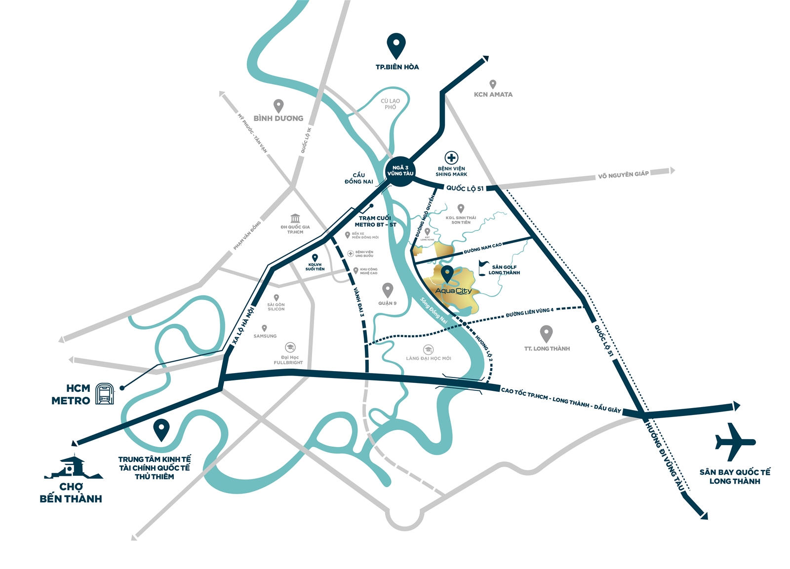 Dự án Aqua City mang lợi thế lớn về vị trí khi tọa lạc ngay tại tâm điểm kết nối giao thông liên vùng.