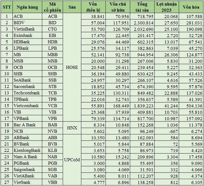 Các cổ phiếu ngân hàng có vốn hóa dưới 100.000 tỷ đồng gồm: HDB (67.541 tỷ đồng), STB (57.876 tỷ đồng), SSB (57.526 tỷ đồng), VIB (55.810 tỷ đồng), LPB (45.270 tỷ đồng), SHB (43.433 tỷ đồng), TPB (41.391 tỷ đồng), EIB (32.728 tỷ đồng), OCB (32.363 tỷ đồng) và MSB (31.200 tỷ đồng).