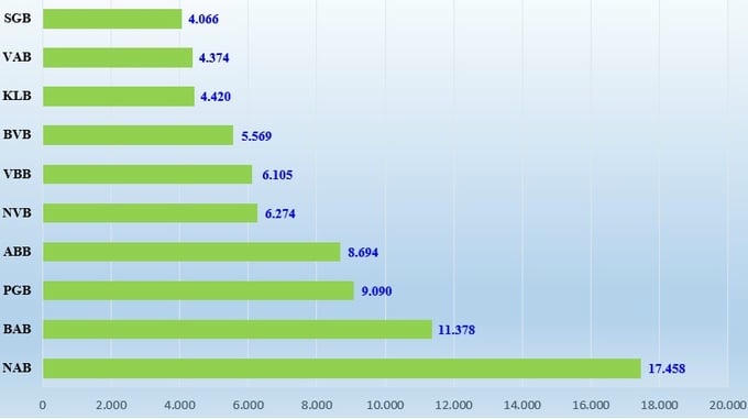 Ngoại trừ BAB có vốn hóa 11.378 tỷ đồng thì 8 cổ phiếu ngân hàng còn lại đều có vốn hóa dưới 10.000 tỷ đồng. Đó là PGB, ABB, NVB, BVB, VBB, KLB, VAB, SGB.