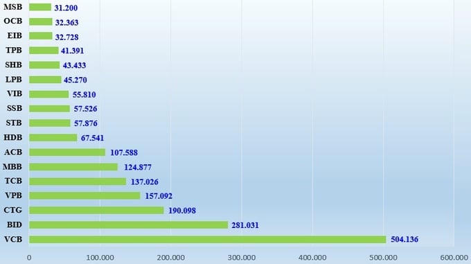 Tính đến thời điểm hiện tại, có 7 cổ phiếu ngân hàng có vốn hóa đạt trên 100.000 tỷ đồng. Ngoài VCB, BID, CTG kể trên, còn có VPB (157.092 tỷ đồng), TCB (137.026 tỷ đồng), MBB (124.877 tỷ đồng) và ACB (107.588 tỷ đồng).