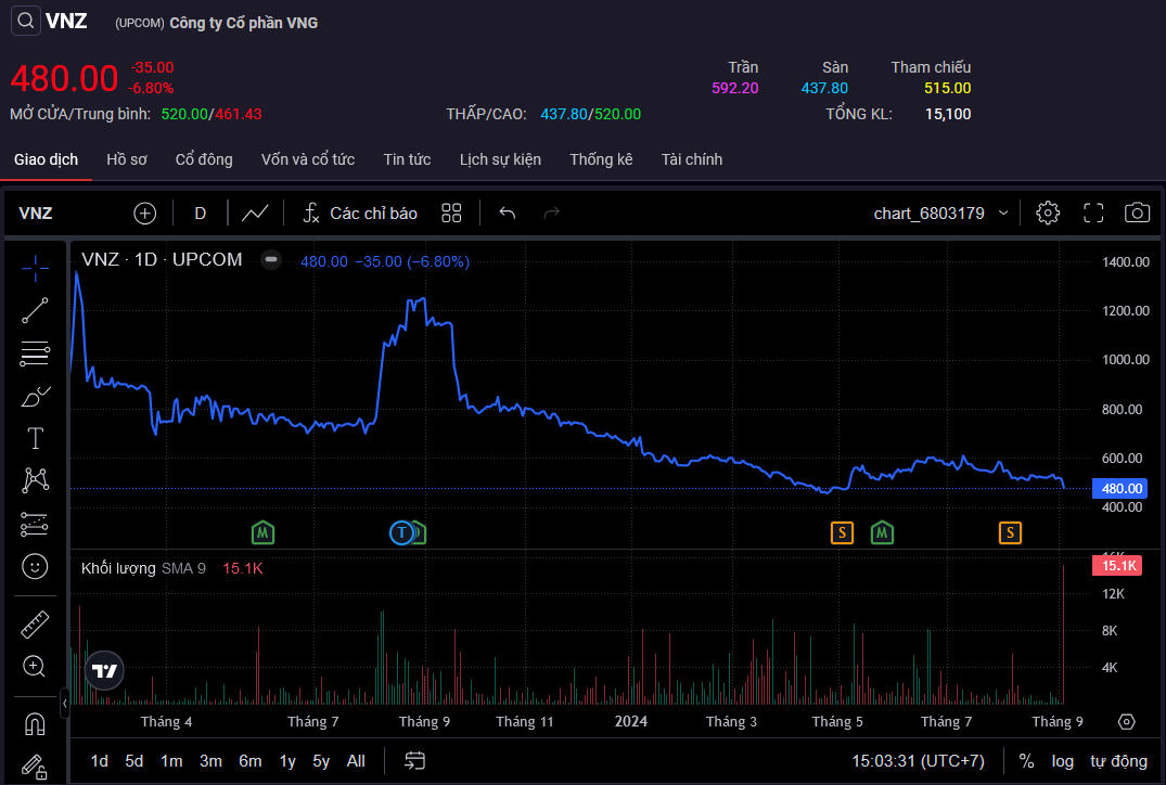 Cổ phiếu VNZ của Công ty Cổ phần VNG có lúc giảm kịch sàn nhưng sau đó đã dần phục hồi. Dẫu vậy kết phiên 6/9, thị giá VNZ vẫn giảm khá sâu.