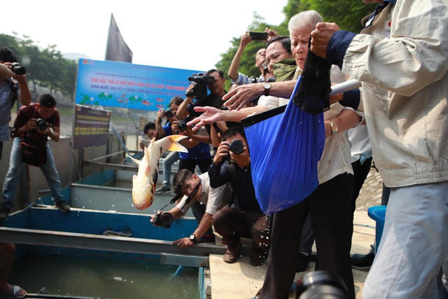 Đến khoảng 10h sáng cùng ngày, Tổ chức xúc tiến Thương mại - Môi trường Nhật Bản cũng tiến hành thả cá Koi Nhật Bản, cá chép Tam Dương xuống khu thí điểm làm sạch bằng công nghệ Nhật Bản tại góc Hồ Tây.