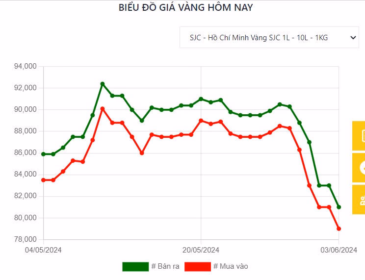 Cụ thể, tính đến 9h ngày 3/6, giá vàng miếng hôm nay được niêm yết ở mức 79 triệu đồng/lượng chiều mua vào và 81 triệu đồng/lượng chiều bán ra.