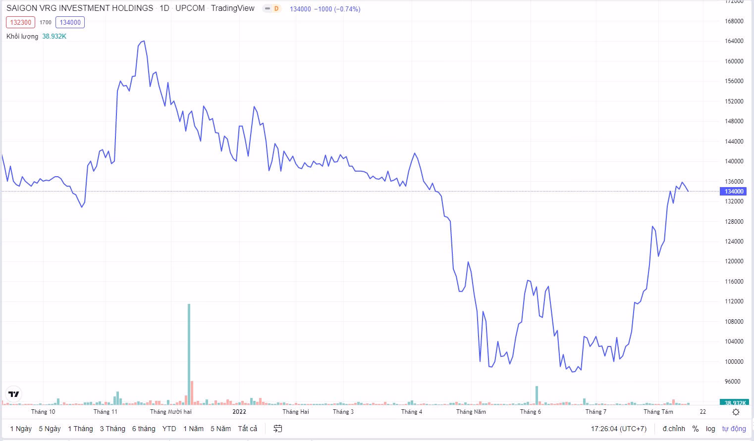 Với giá trị thị trường đang giao dịch 134.000 đồng/cổ phiếu (đóng cửa phiên ngày 15/8), ước tính vốn hoá của Đầu tư Sài Gòn VRG đang khoảng 12.449 tỷ đồng.