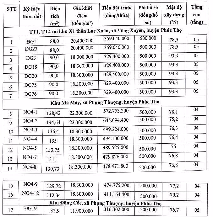 Cụ thể là quyền sử dụng đất ở đối với 7 thửa đất thuộc TT1, TT4 tại khu X1 thôn Lục Xuân, xã Võng Xuyên; 9 thửa đất khu Mả Mảy; một thửa khu Đồng Cốc, xã Phụng Thượng, huyện Phúc Thọ, TP Hà Nội. Các thửa đất có diện tích từ 88 đến 136 m2/thửa với giá khởi điểm từ 11,9 đến 22,3 triệu đồng/m2.