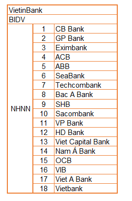 Danh sách 18 tổ chức tín dụng có VPBank, HDBank, VietCapitalBank, Nam A Bank, OCB, VIB, Viet A Bank, VietBank, CB Bank, GP Bank, Eximbank, ACB, ABB, SEABank, Techcombank, Bac A Bank, SHB, Sacombank.