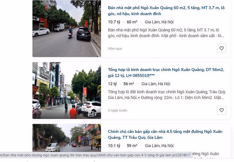Giá đất thuộc khu vực Trâu Quỳ (Gia Lâm) ở thời điểm hiện tại có thể lên tới hơn 200 triệu đồng/m2, dao động ở mức trung bình từ 80-90 triệu đồng/m2. Đất mặt tiền Ngô Xuân Quảng cách đây mấy năm được chào giá từ 100-120 triệu đồng/m2 nay giá rao bán là 180-220 triệu đồng/m2.