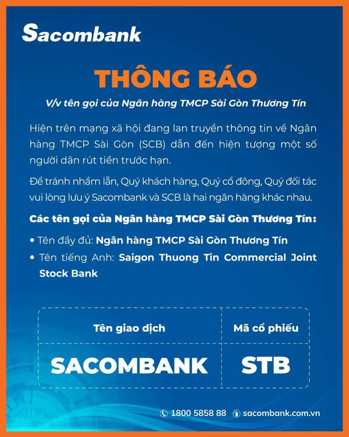 Những thông tin tích cực trên được Sacombank thông tin trong bối cảnh nhiều khách hàng nhầm lẫn giữa Ngân hàng SCB với Ngân hàng TMCP Sài Gòn Thương Tín (Sacombank).