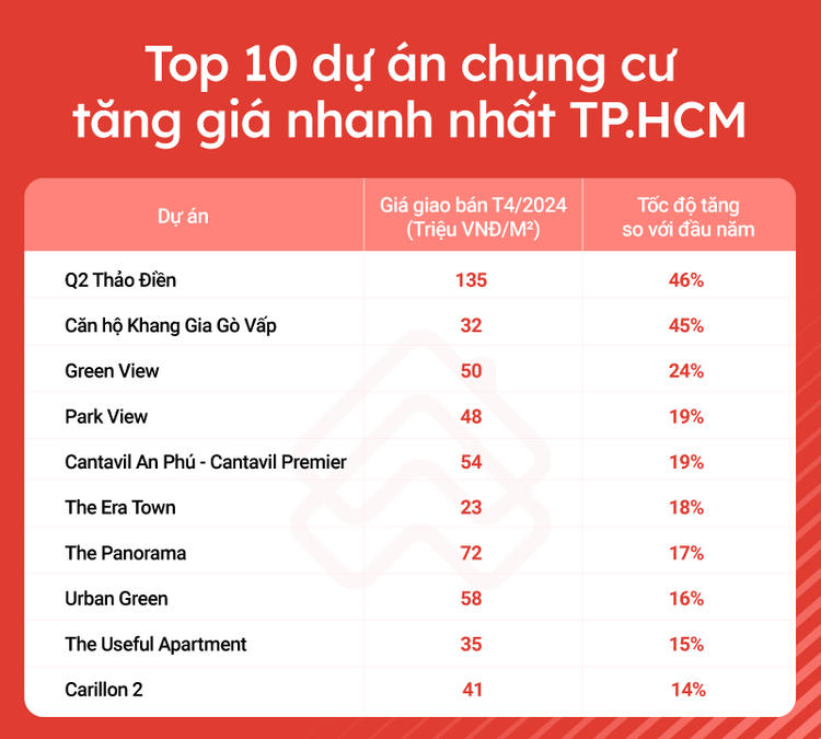 Còn ở TP. HCM, người tìm kiếm chung cư quan tâm nhiều nhất đến Vinhomes Grand Park, Vinhomes Central Park, Celadon City, Q7 Saigon Riverside, Mizuki Park, Masteri Thảo Điền, Vinhomes Golden River Ba Son, Sunrise City, Eco Green Sài Gòn, CityLand Park Hills. Danh sách này đa số là các dự án lớn, ở khu vực dân cư đông đúc.