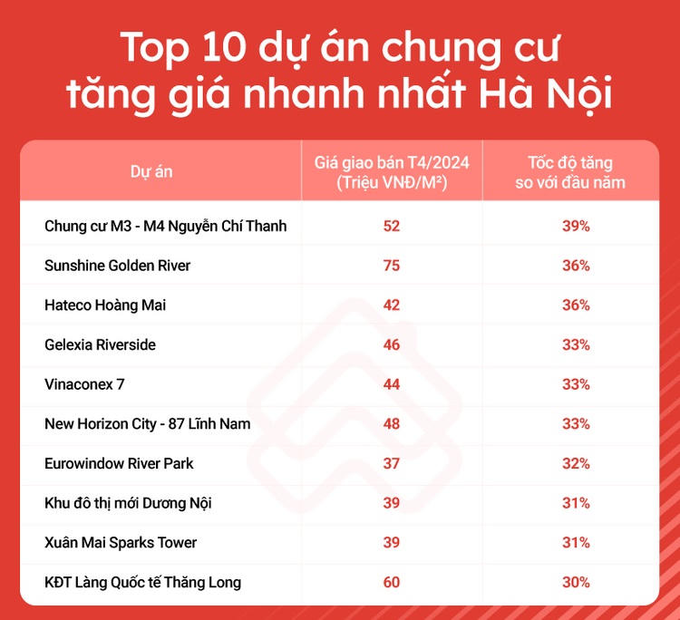 Cũng theo dữ liệu của kênh trên, 10 dự án chung cư được tìm kiếm nhiều nhất Hà Nội trong 4 tháng đầu năm này gồm: Vinhomes Ocean Park Gia Lâm, Vinhomes Smart City, Vinhomes Green Bay Mễ Trì, Khu đô thị Thanh Hà Mường Thanh, Khu đô thị mới Xa La, Khu đô thị Việt Hưng, Khu đô thị Trung Hòa –-Nhân Chính, Khu đô thị Geleximco - Lê Trọng Tấn, Khu đô thị mới Văn Phú và Khu đô thị mới Linh Đàm. Phần lớn các dự án này có mức giá tương đối mềm, với nguồn cung sơ cấp lớn và tập trung ở khu vực phía Tây.