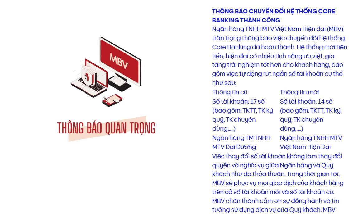 Theo MBV, hệ thống mới tiên tiến, hiện đại có nhiều tính năng ưu việt, gia tăng trải nghiệm tốt hơn cho khách hàng, bao gồm việc tự động rút ngắn số tài khoản. Cụ thể, số tài khoản của khách hàng sẽ được rút ngắn từ 17 số xuống còn 14 số nhưng vẫn giữ nguyên quyền và nghĩa vụ giữa ngân hàng và khách hàng như đã thỏa thuận.