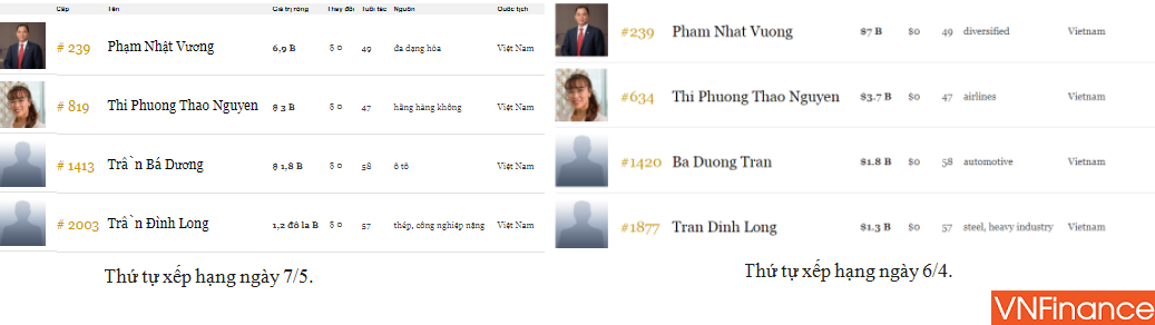 Theo số liệu từ Tạp chí danh tiếng thế giới Forbes, tính đến ngày hôm nay 7/5, tài sản cũng như vị trí xếp hạng của 4 tỷ phú Việt Nam trên bảng xếp hạng tỷ phú thế giới có nhiều biến động.