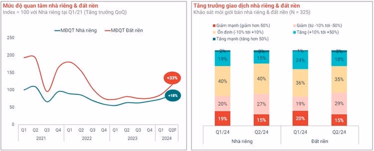 Cũng theo báo cáo trong nửa đầu năm 2024 của kênh Batdongsan, loại hình nhà riêng và đất nền ghi nhận những chuyển biến tích cực ở cả lượt tìm kiếm và giao dịch. Nếu so với quý I/2023 thì lượt tìm kiếm đất nền đã phục hồi khoảng 33%, lượt tìm kiếm nhà riêng phục hồi khoảng 18%.