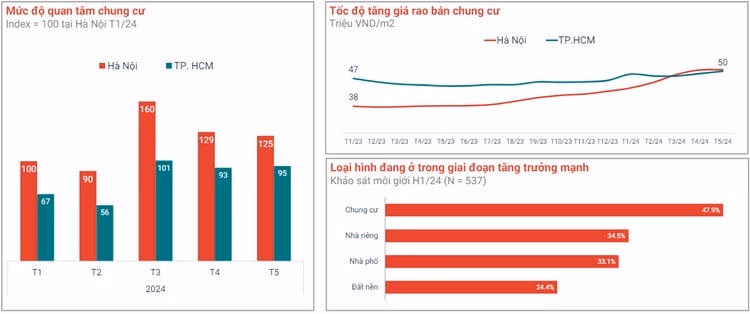 Trong tất cả các phân khúc, chung cư là từ khóa hot nhất trên thị trường bất động sản nửa đầu năm 2024, đặc biệt tại thị trường Hà Nội. Khan hiếm nguồn hàng và giá bán tăng vọt khiến chung cư Hà Nội tiệm cận mặt bằng giá chung cư TP. HCM dù trước đó chưa đầy hai năm, khoảng cách này khá xa.