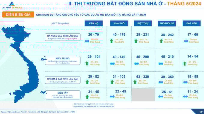 Cụ thể, đối với loại hình căn hộ, giá bán ở Hà Nội, Hưng Yên, Bắc Ninh, Bắc Giang, Quảng Ninh duy trì ổn định theo tháng, dao động 26 - 70 triệu/m2. Trong khi đó, khu vực miền Trung dao động 29 - 104 triệu/m2 ( mức tăng cao nhất từ tăng 4 - 6%); TP HCM và các tỉnh lân cận dao động 29 - 82 triệu/m2 (tăng 1 - 2%) và miền Tây khoảng 31 - 45 triệu/m2 (tăng 3 - 5%).