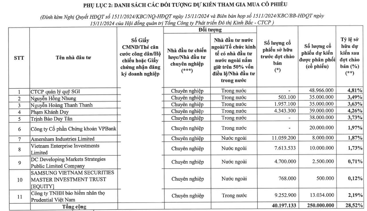 Danh sách nhà đầu tư tham gia đợt chào bán cổ phiếu riêng lẻ tới đây của Kinh Bắc có sự góp mặt của các cá mập tỷ USD cùng nhiều tổ chức tài chính tiếng tăm.
