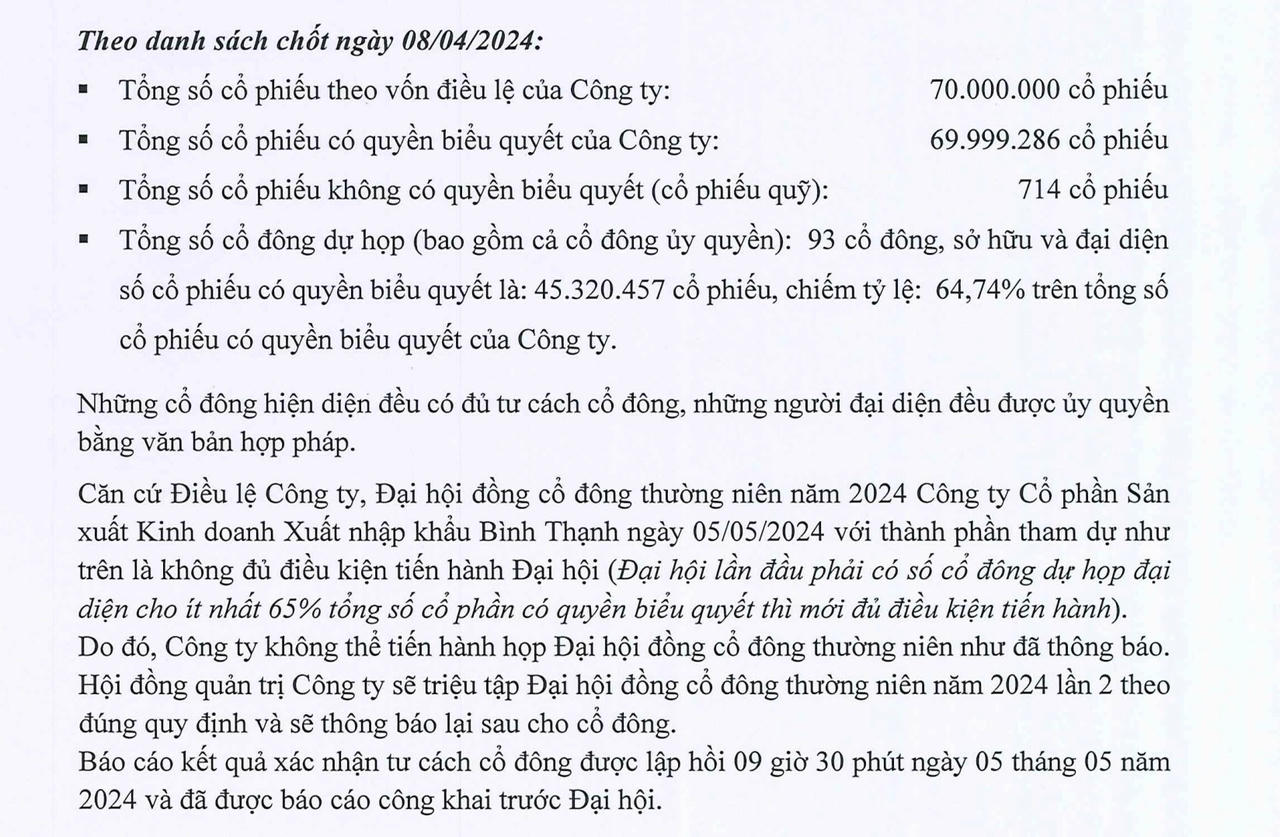 Mới đây, Công ty CP Sản xuất Kinh doanh Xuất nhập khẩu Bình Thạnh (Gilimex, HoSE: GIL) đã báo cáo về việc không thể tổ chức ĐHĐCĐ thường niên 2024 vào ngày 5/5. Nguyên nhân là do số cổ đông dự họp đại diện không đủ trên 65% tổng số phiếu biểu quyết.