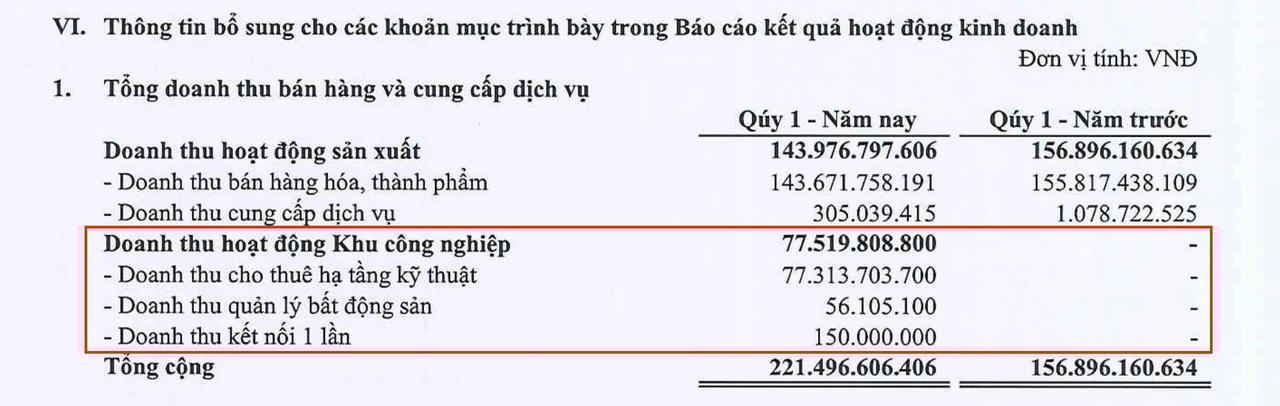 Trên thực tế, trong 3 tháng đầu năm, mảng bất động sản khu công nghiệp tiếp tục “toả sáng” và có những đóng góp tích cực vào kết quả kinh doanh của Gilimex. Theo báo cáo tài chính hợp nhất quý I/2024, doanh thu từ mảng này đạt xấp xỉ 78 tỷ đồng, tăng gấp hơn 5 lần so với quý IV/2023 - lần đầu tiên Gilimex ghi nhận doanh thu từ bất động sản, đóng góp 35% vào tổng doanh thu.