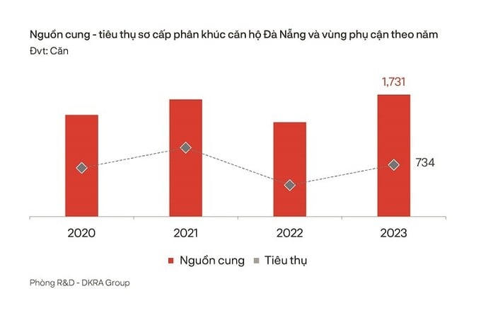 Trong khi đó, thị trường căn hộ ghi nhận 14 dự án triển khai bán hàng trong năm với nguồn cung sơ cấp toàn thị trường rơi vào khoảng 1,731 căn, tăng 29% so với năm 2022, chủ yếu phân bố tại Đà Nẵng. Tỷ lệ tiêu thụ trên nguồn cung sơ cấp đạt khoảng 42%, tương đương 734 căn, tăng 66% so với năm trước. Sức cầu chung toàn thị trường ghi nhận tăng 9 điểm phần trăm so với năm 2022, tuy nhiên phần lớn chỉ đến từ một dự án mới được mở bán tại khu vực quận Ngũ Hành Sơn (Đà Nẵng).