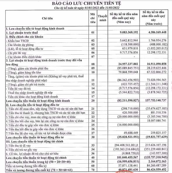 Cụ thể, tại báo cáo lưu chuyển tiền tệ (trên báo cáo tài chính hợp nhất) trong 3 tháng đầu năm 2022, dòng tiền thuần từ hoạt động kinh doanh tại Phục Hưng Holdings ghi nhận âm hơn 82 tỷ đồng trong khi cùng kỳ 2021 dương gần 158 tỷ đồng.