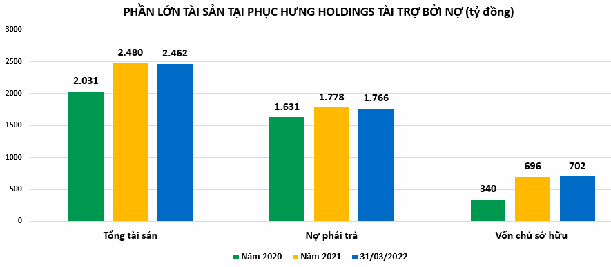 Báo cáo tài chính hợp nhất quý 1/2022 cho thấy, tính đến 31/3/2022, tổng tài sản tại Phục Hưng Holdings ghi nhận hơn 2.480 tỷ đồng, xấp xỉ đầu năm, được hình thành từ 1.778 tỷ đồng nợ phải trả, tương đương tỷ số nợ phải trả trên tổng tài sản là 72% và chỉ có 702 tỷ đồng vốn chủ sở hữu. Do đó, nợ phải trả đang cao gấp 2,5 lần vốn chủ sở hữu.