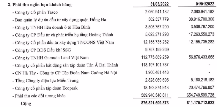 Các khoản phải thu lớn có sự xuất hiện các tên tuổi như: CTCP bất động sản tập đoàn Tân Á Đại Thành (118 tỷ đồng); Công ty TNHH Gamuda Land Việt Nam (gần 113 tỷ đồng); CTCP Tập đoàn Ecopark (18 tỷ đồng); CTCP đầu tư xây dựng TNCONS Việt Nam (12 tỷ đồng); CTCP BĐS Dầu khí SSG (gần 10 tỷ);...
