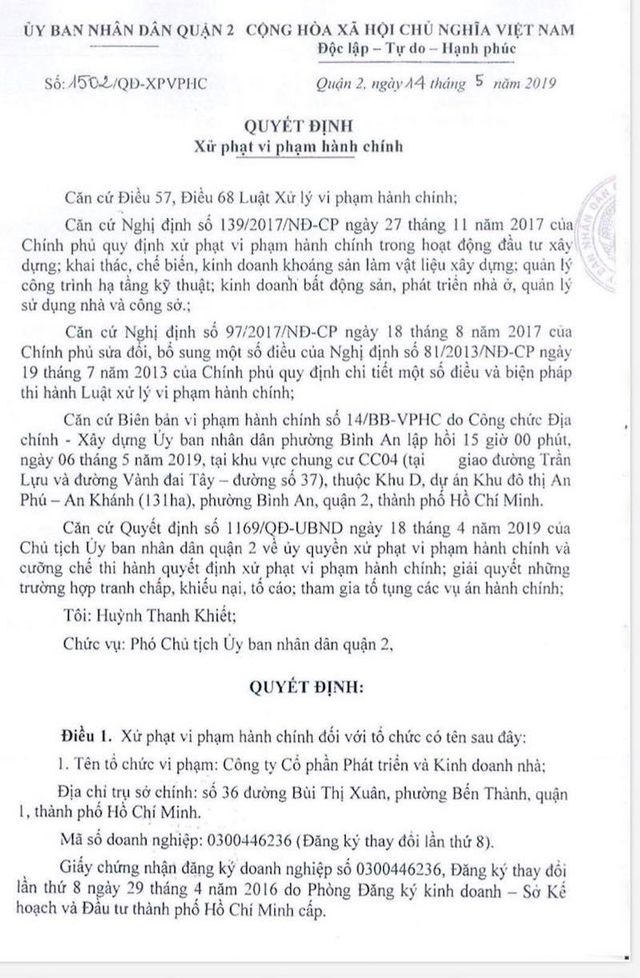 Quyết định do ông Huỳnh Thanh Khiết, Phó Chủ tịch UBND Quận 2 ban hành nêu rõ: ông Đinh Trường Chinh, Chủ tịch Hội đồng quản trị Công ty cổ phần Phát triển và Kinh doanh nhà (36 đường Bùi Thị Xuân, phường Bến Thành, quận 1, TP.HCM) đã có hành vi vi phạm hành chính là tổ chức xây dựng công trình không có giấy phép xây dựng mà theo quy định phải có giấy phép xây dựng.