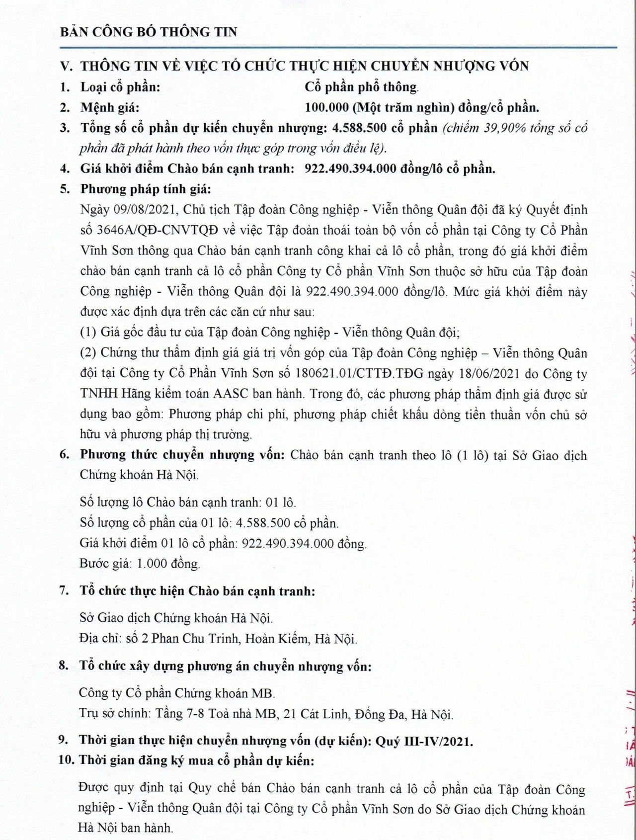 Thời điểm đầu tháng 8/2021 Tập đoàn Công nghiệp - Viễn thông Quân đội (Viettel) thông báo về việc chào bán cạnh tranh toàn bộ lô gần 4,6 triệu cổ phần đang nắm giữ tại CTCP Vĩnh Sơn. Đáng chú ý đây là lần thứ ba Viettel rao bán cổ phiếu Vĩnh Sơn. Cả hai lần trước đều không thể tổ chức do không có nhà đầu tư nào đăng ký tham dự đấu giá.