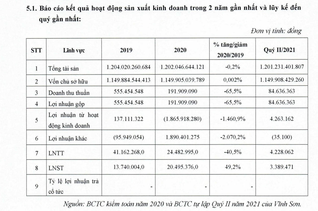 Lũy kế 6 tháng đầu năm 2021, doanh thu của Vĩnh Sơn chỉ đạt hơn 84 triệu đồng và LNST chỉ hơn 3 triệu đồng. Tính đến hết tháng 6, doanh nghiệp còn hơn 61 triệu đồng tiền mặt và hơn 82 triệu đồng tiền gửi ngân hàng, tổng giá trị giảm hơn 48 triệu đồng so với đầu năm.